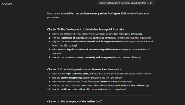 Dennoch kann ich nicht behaupten, dass ich nicht neugierig gewesen wäre, ChatGPT für meine eigenen Probleme zu Hilfe zu nehmen. Für mich liegt sein Wert besonders in seinen Fähigkeiten als Lernhilfe. Während des ersten Semesters meines Masterstudiums musste ich mich beispielsweise auf drei Prüfungen vorbereiten. Anstatt die PowerPoint-Präsentationen wiederholt durchzulesen, habe ich meine Notizen in ChatGPT hochgeladen und die KI gebeten, mir auf den Stoff bezogene Fragen zu stellen. Das hat mir sehr dabei geholfen, das gerade gelernte Wissen zu festigen und manchmal sogar besser zu verstehen. Natürlich war es ärgerlich, wenn mir der freie Speicherplatz ausging und ich keine weiteren Fragen mehr stellen konnte.